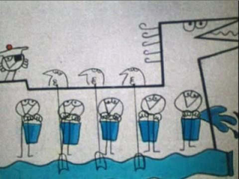 The Shadoks were bird-like in appearance, were characterised by ruthlessness and stupidity and inhabited a two dimensional planet. This planet was of irregular shape, which was continuously changing - causing major earthquakes - hence their desire to find a new home world. There was a series of caves on the Shadok planet, known as the "Gulp" which was essentially a prison for undesirables. One Shadok who stood apart from the others was the pirate - who was habitually drunk - and instead of the popular hobby of putting ships into bottles - he liked to put bottles into his ship.